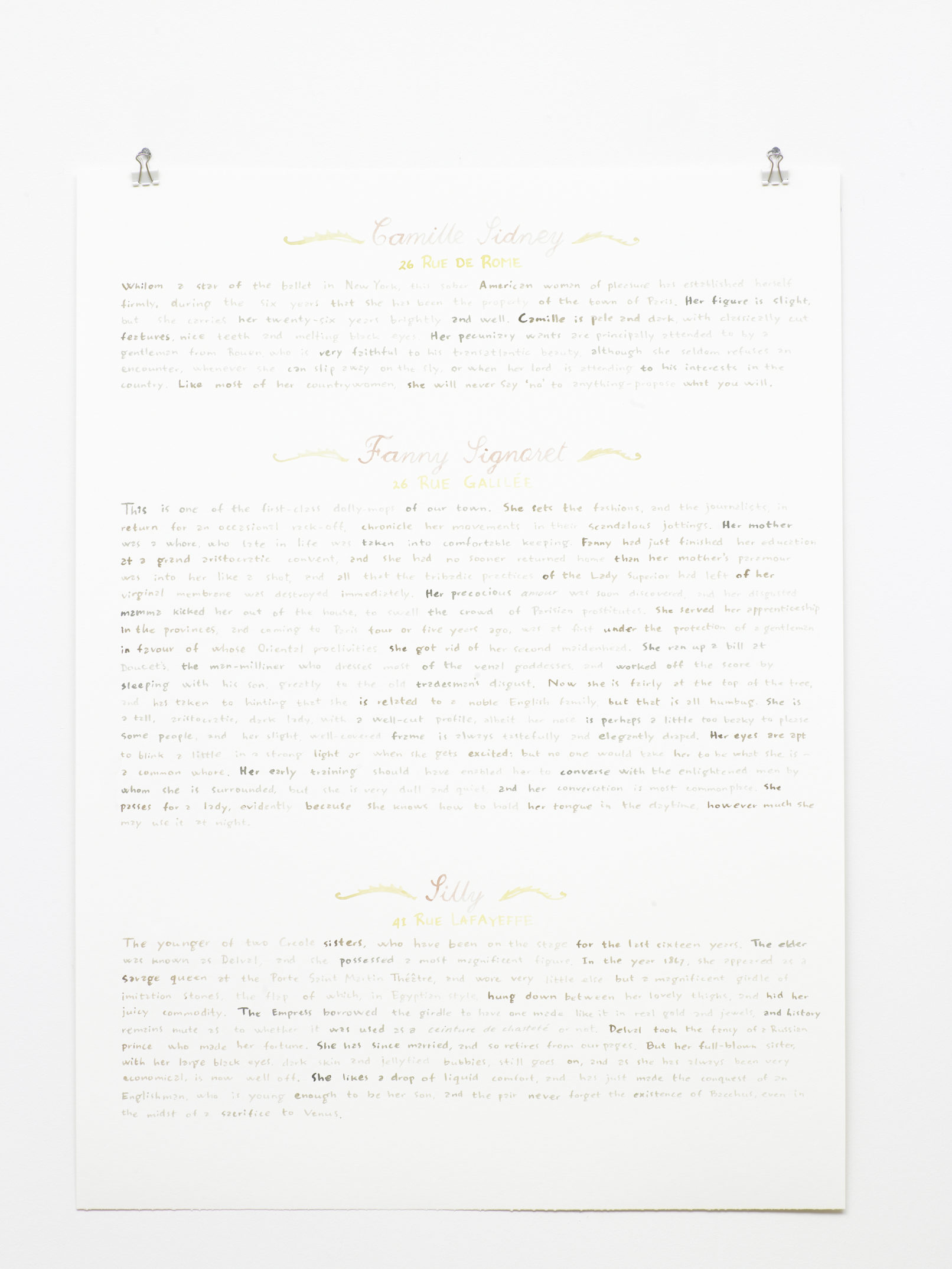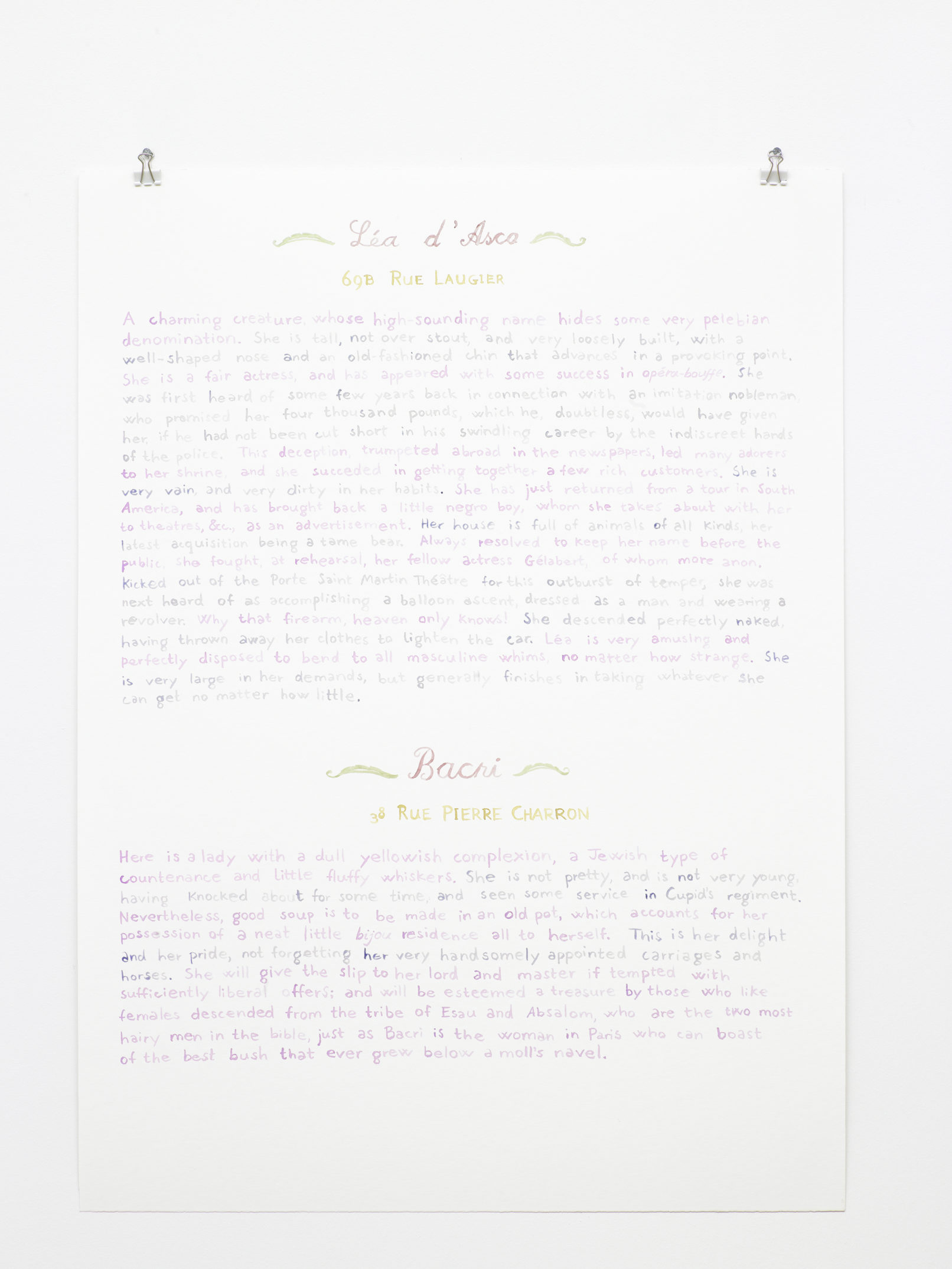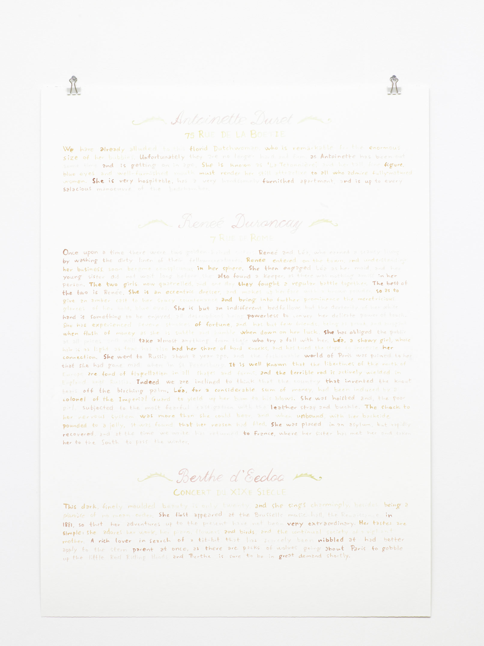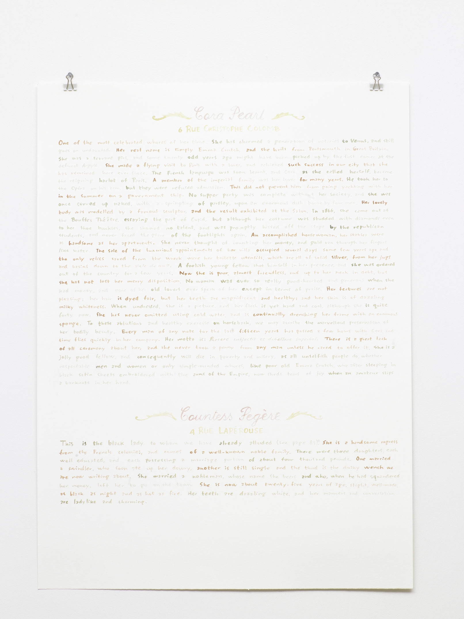Series of watercolours on paper, where the full text from, The Pretty Women of Paris, a guide book, is watercolored. The book is said to have been printed unofficially in the year of 1883 for Brithish trawellers on their way to Paris. It contains addresses and description of Parisian prostitutes from that time. 252 texts in the whole. A couple of years later I wandered the streets of Paris on foot, for two months, visiting all the addresses and paid my tribute to the women in question.
