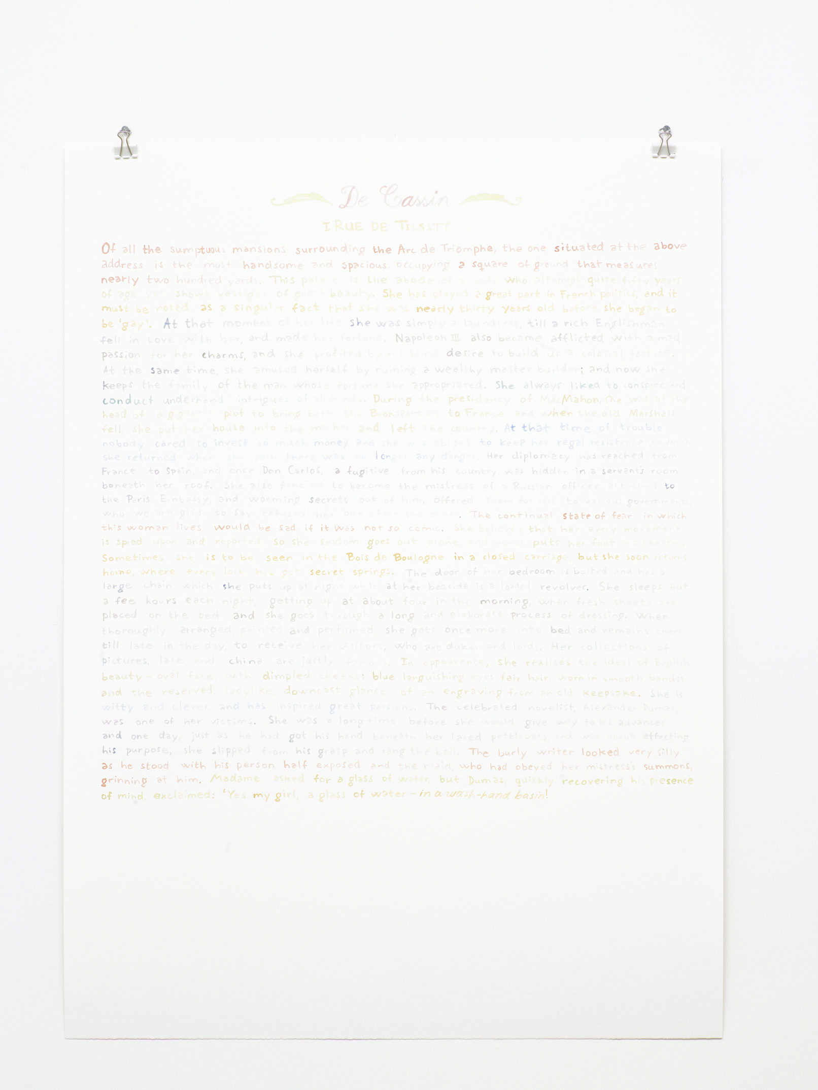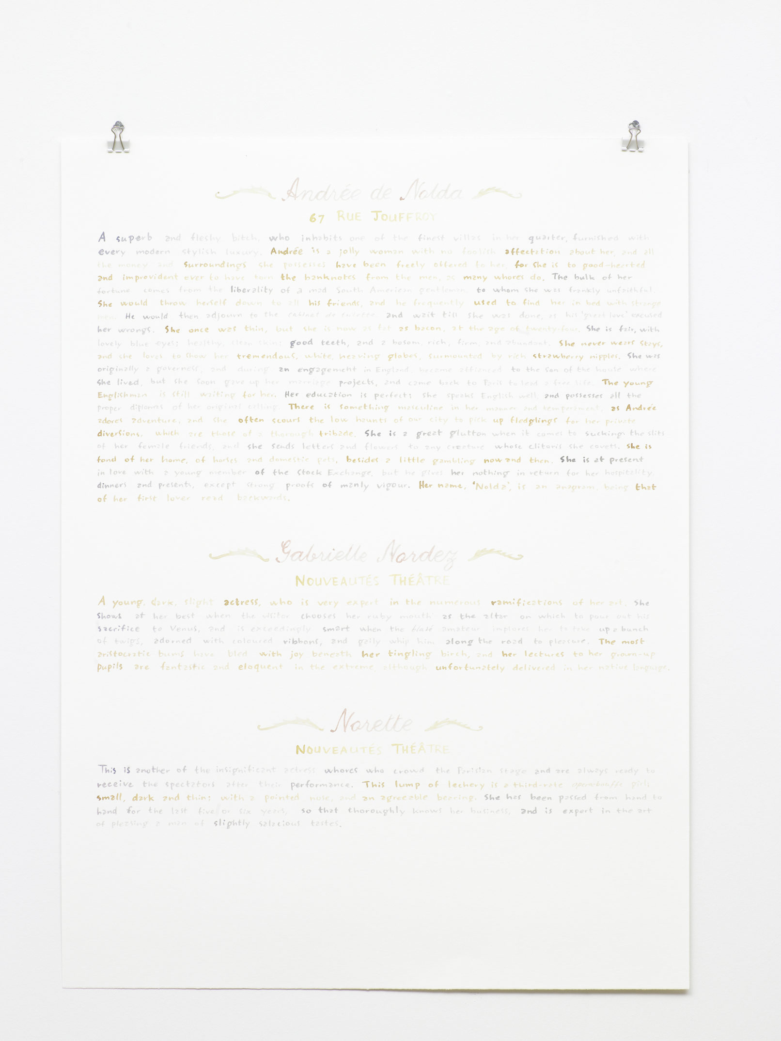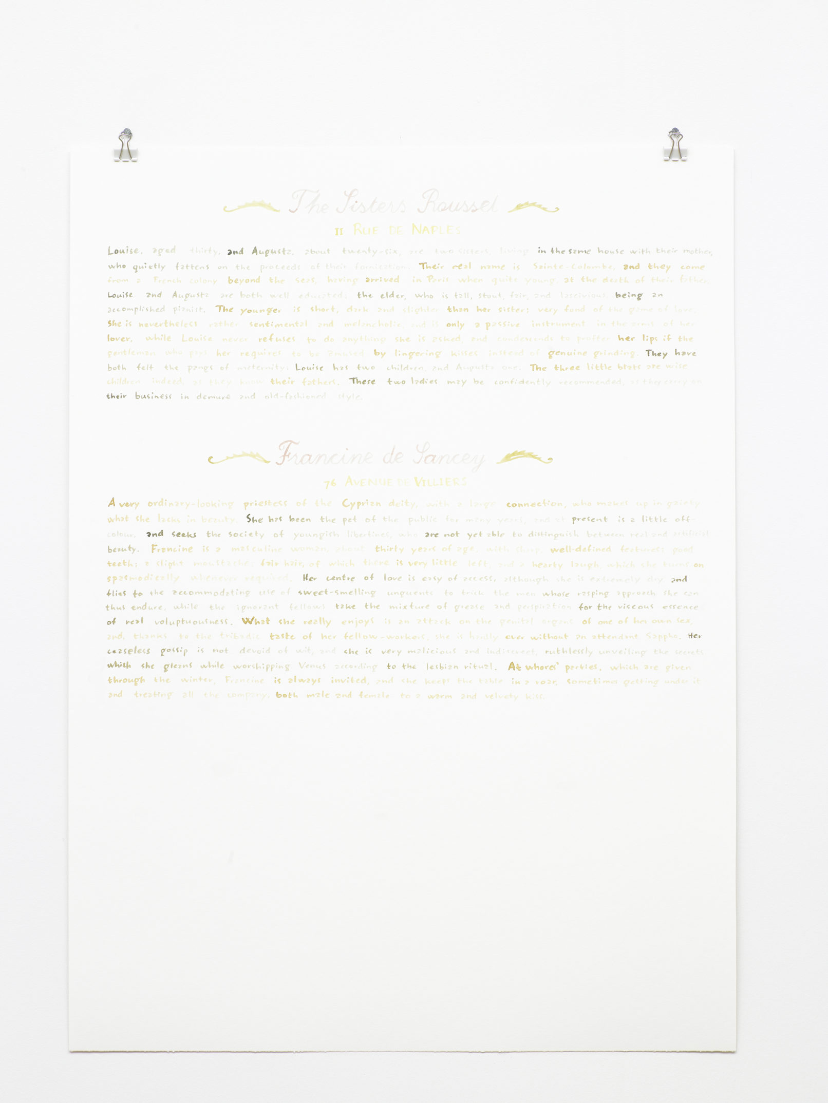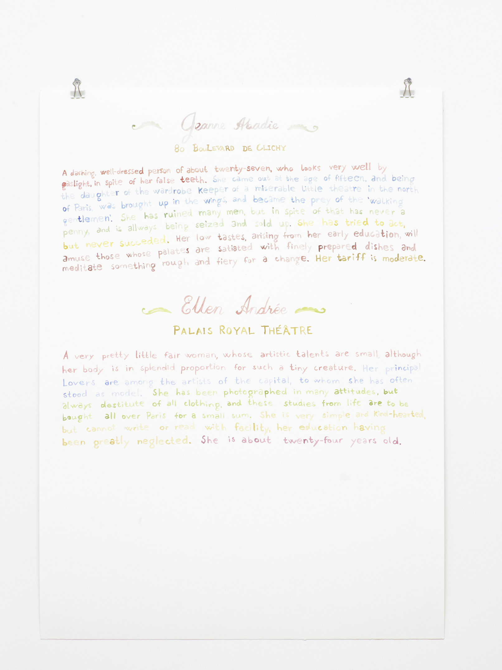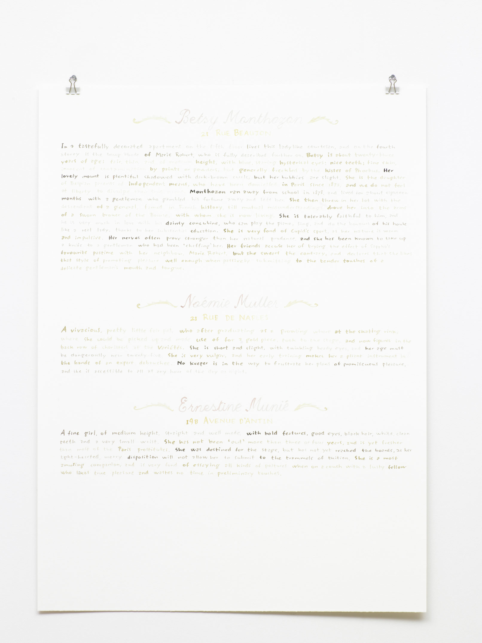 Series of watercolours on paper, where the full text from, The Pretty Women of Paris, a guide book, is watercolored. The book is said to have been printed unofficially in the year of 1883 for Brithish trawellers on their way to Paris. It contains addresses and description of Parisian prostitutes from that time. 252 texts in the whole. A couple of years later I wandered the streets of Paris on foot, for two months, visiting all the addresses and paid my tribute to the women in question.