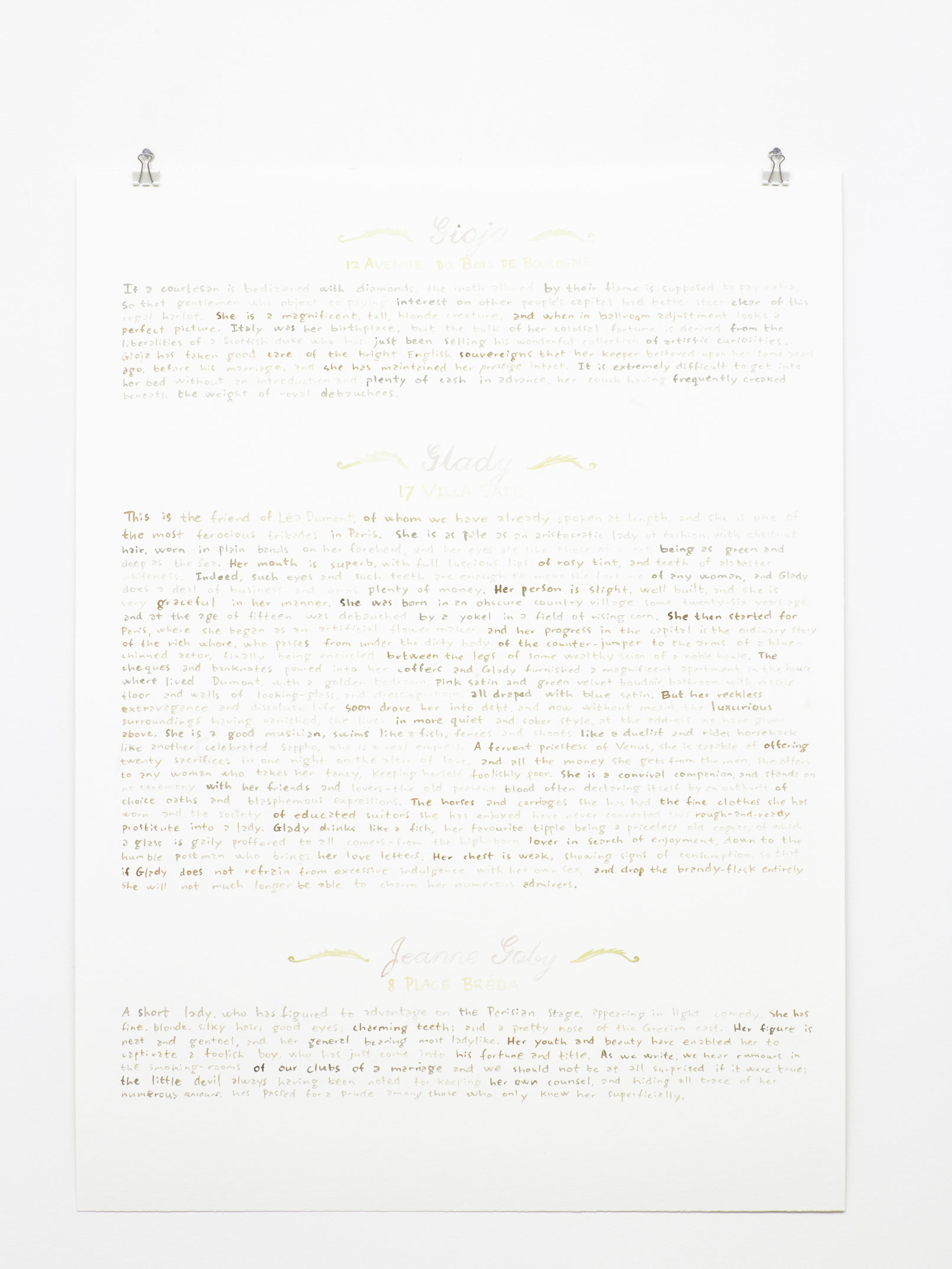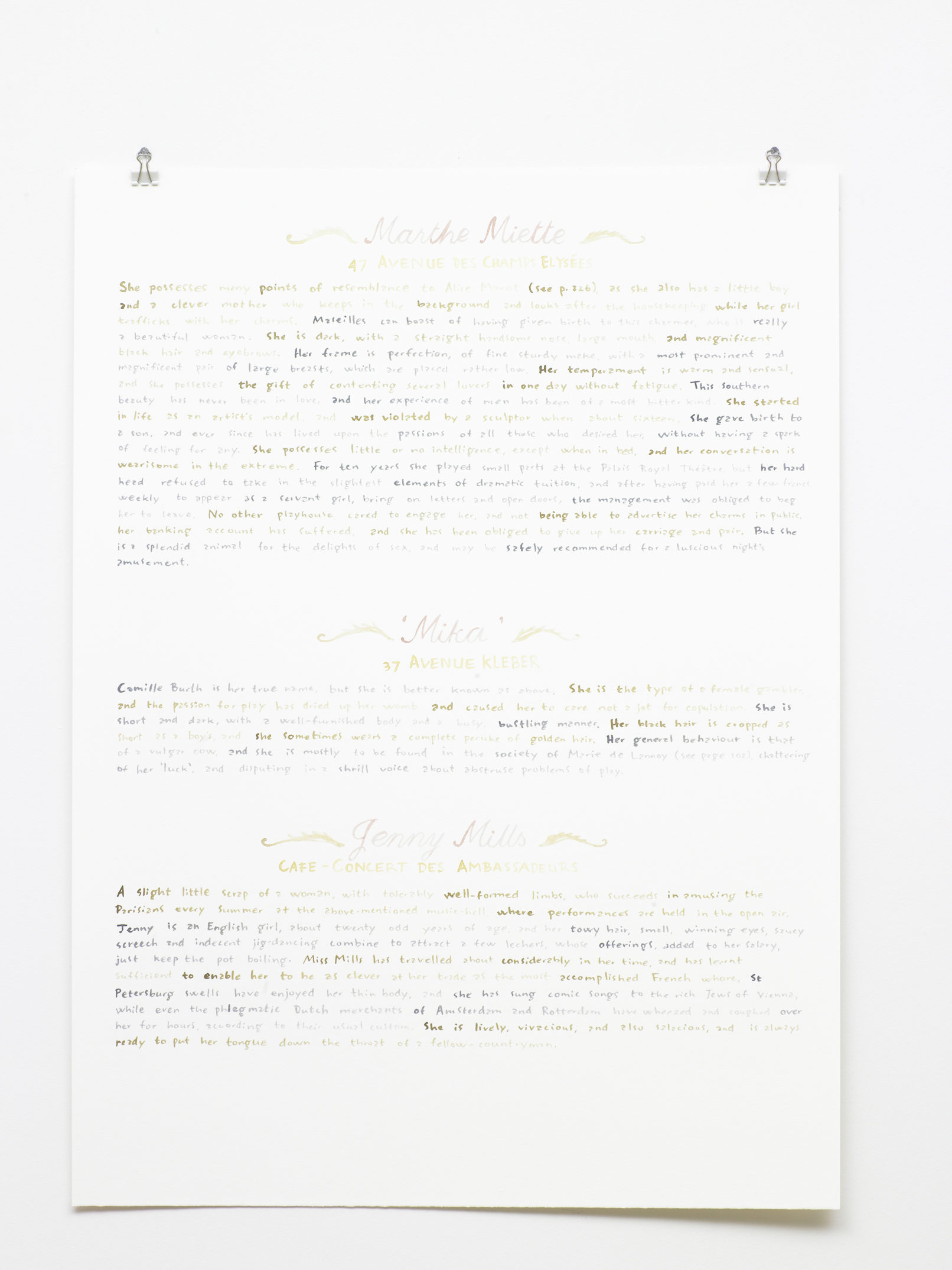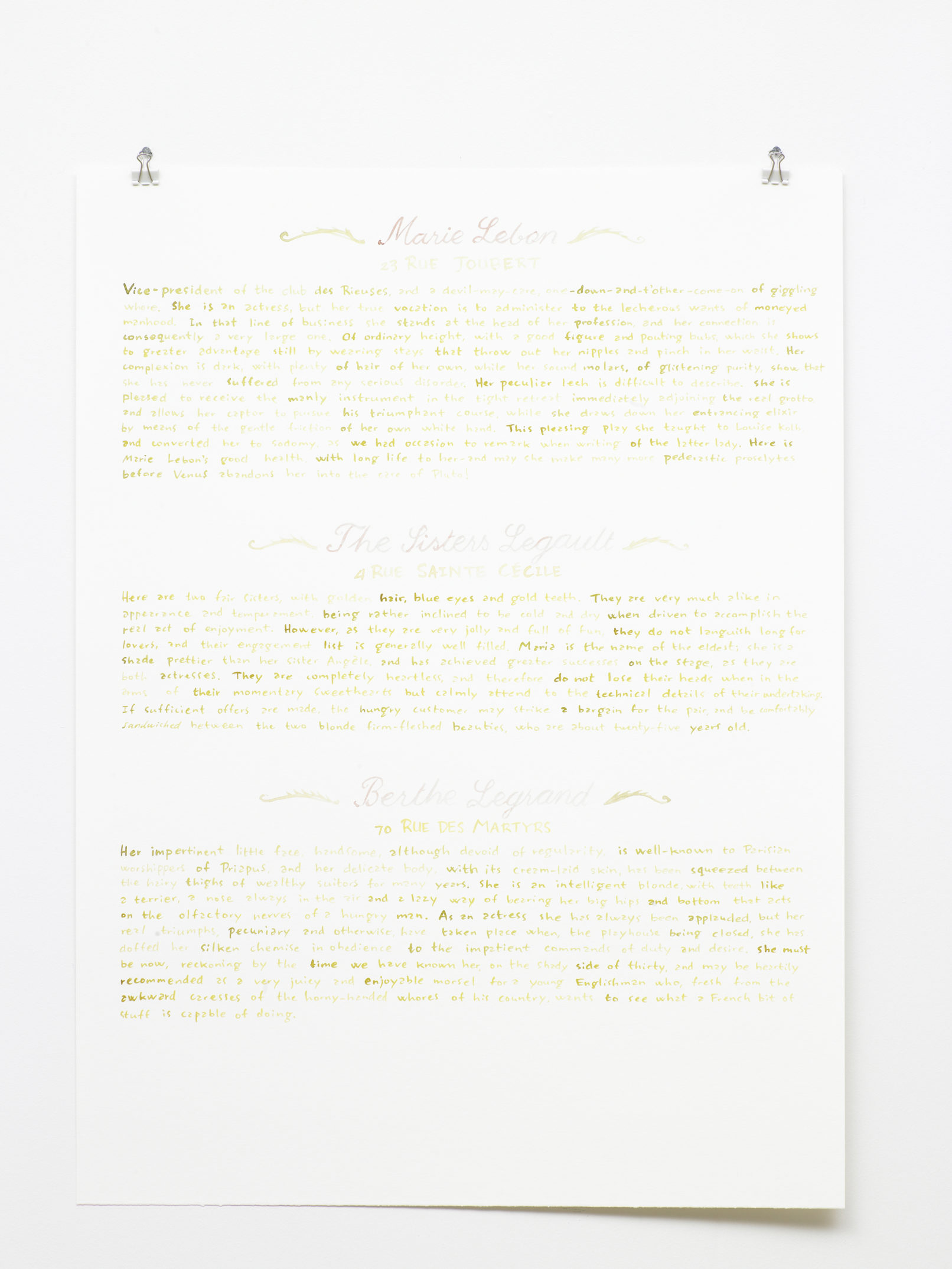 I first knew about the book: The pretty women of Paris, from reading the book: On blondes, by Joanne Pitman. Ordered a republication, a few years ago, (impossible to get hands on the original any more). Always had the idea to use the content in one way or the other for an art work. Early 2008 I decided to start working on the series. What interested me instantly was the idea to bring the text into a new context and mirror it towards todays society and the present dialogue about prostitution and relative matters. Publication of books like these were not common though it excisted. In a republication from 1884, (which is there stated as the first edition), the edition is limited to 169 copies for a certain circulation that has to be worth of interest.