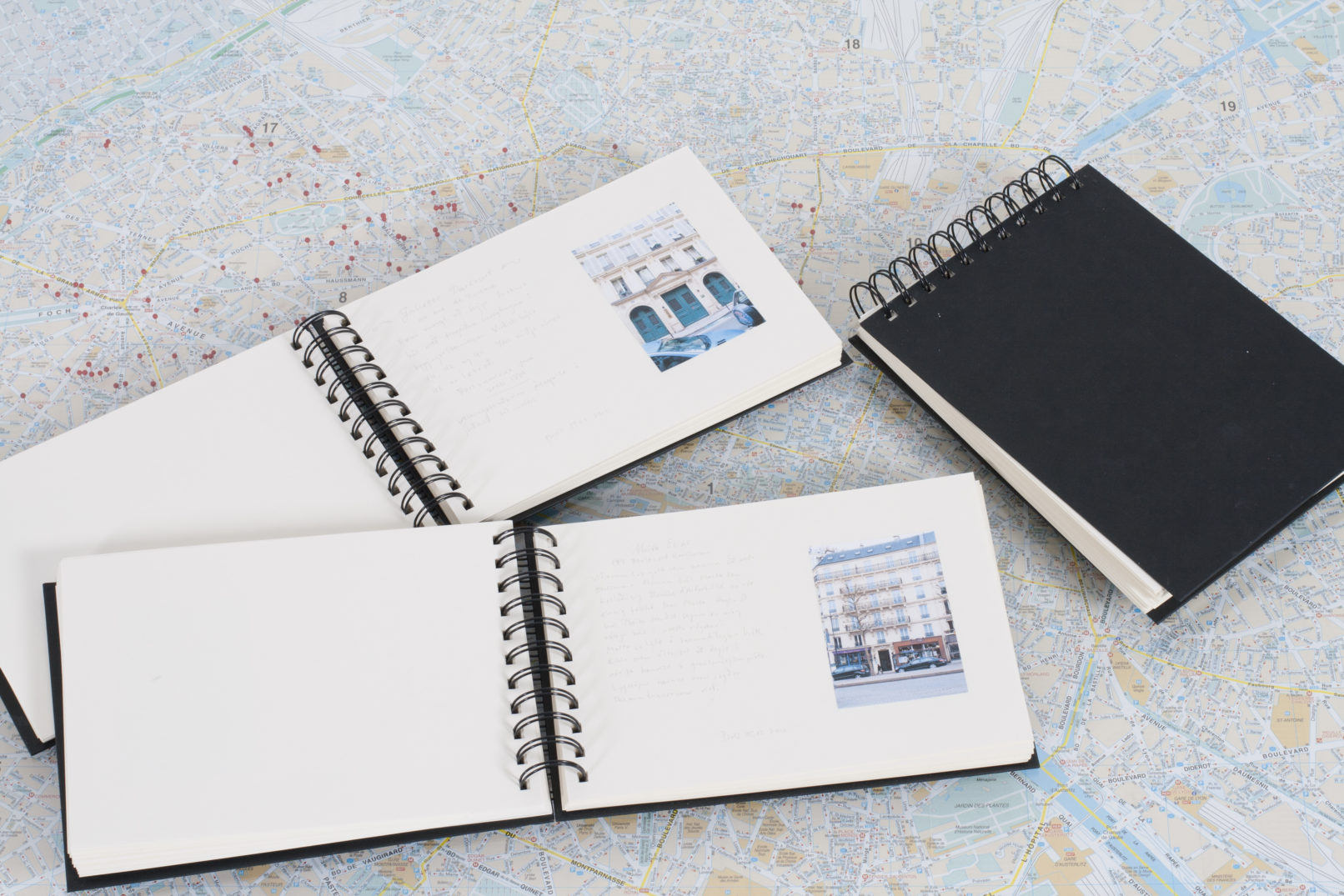 Map of Paris with pinned addresses, notebooks with texts and photographs, watercolour on paper, dimension of works on paper 76 x 56 cm, 2008–2012